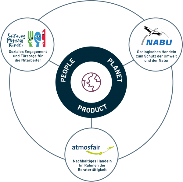 Wir möchten ebenfalls gegenüber der Umwelt, unseren Mitarbeitern sowie der Gesellschaft einen Beitrag für eine bessere Welt leisten. Dabei setzen wir bewusst einen Fokus auf den hohen Norden, denn wir sind der Meinung, dass Nachhaltigkeit bei uns selbst und vor der eigenen Tür beginnt. Bewusst engagieren wir uns in den drei Bereichen „People“, „Product“ und „Planet“ und unterstützen mit Spenden die Stiftung Mittagskinder, die Organisation atmosfair sowie den NABU.